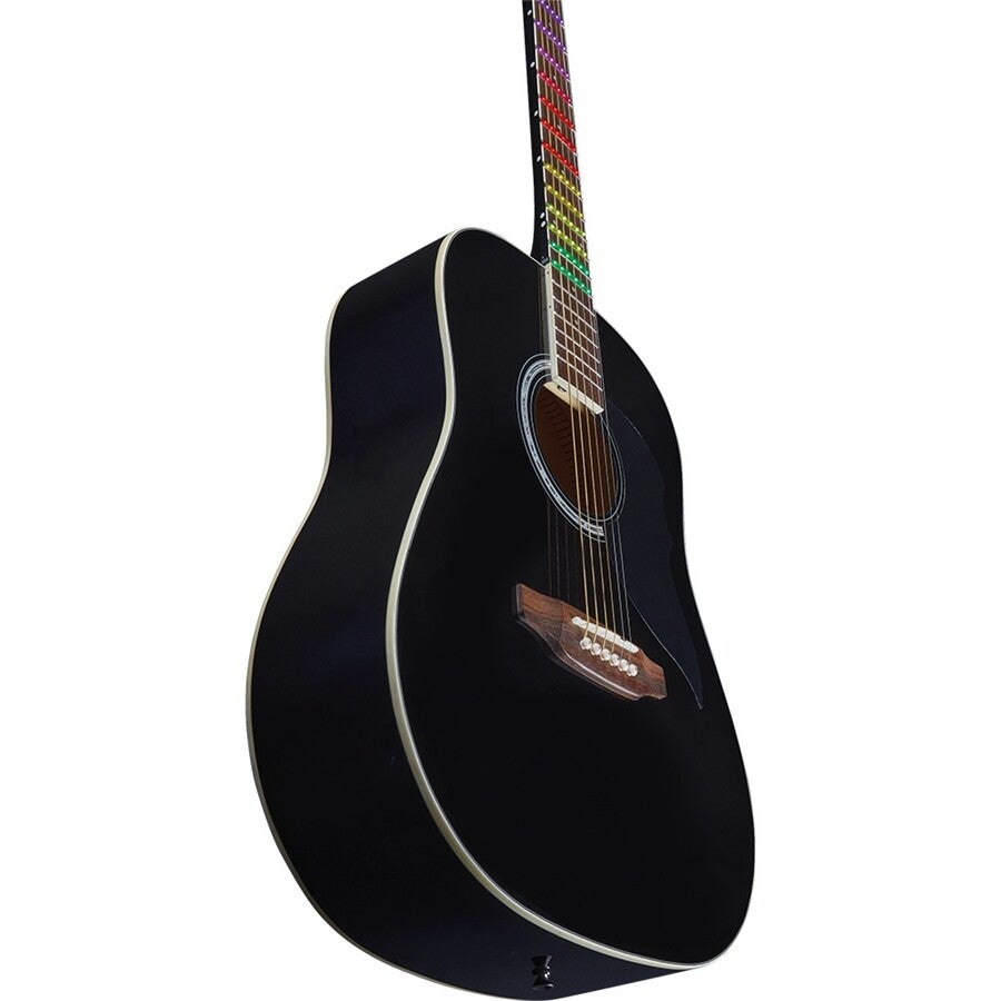 La Ranger 6 Black Visual Note è la chitarra acustica con forma dreadnought della serie "Visual Note" di casa Eko Guitars con Top in Abete, fasce e fondo in Linden, manico in Okoumè e tastiera in South American Roupanà dotata di lamina LED Visual Note che si interfaccia con la APP dedicata. Nell'APP ci sono video lezioni, esercizi, accordatore, scale e arpeggi che vengono trasferiti in tempo reale direttamente sui LED della tastiera per guidare l'utente nell'apprendimento in modo divertente.