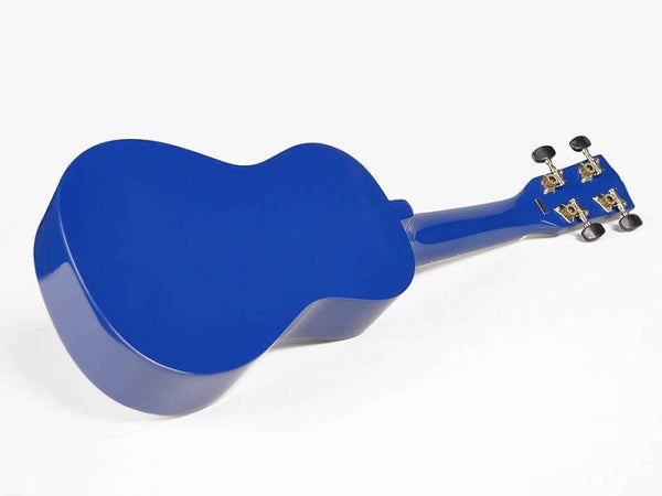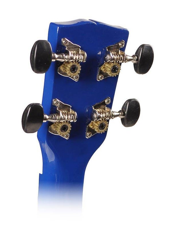 Ukulele soprano in legno, colore blu, finitura lucida. Dotato di meccaniche per chitarra. Borsa inclusa. Scala 346 mm, lunghezza totale 518 mm.