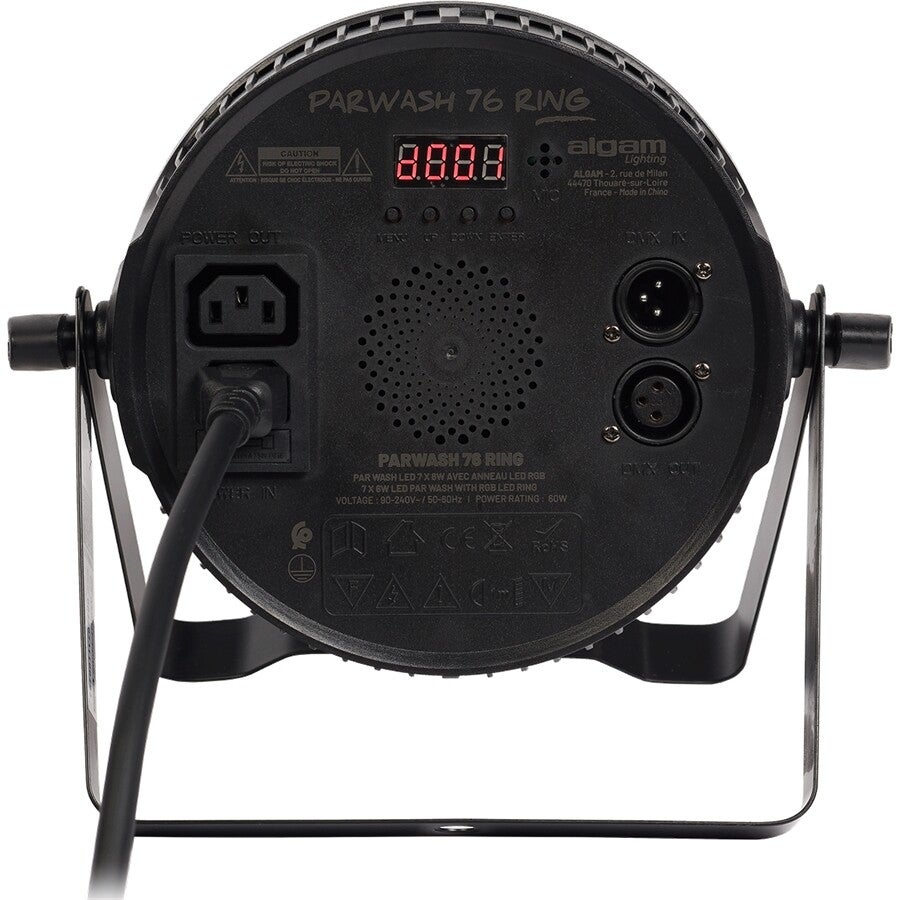 Più che un semplice PAR Wash, l'Algam Lighting PARWASH76-RING è un vero invito alla creatività. I suoi 7 LED RGBW da 6 Watt ciascuno forniscono un fascio abbagliante dai colori sfumati e vibranti, mentre l'anello LED RGB composto da 48 LED si farà notare con i suoi effetti rotanti, o per creare un alone di luce dall'impatto accattivante attorno al fascio principale.